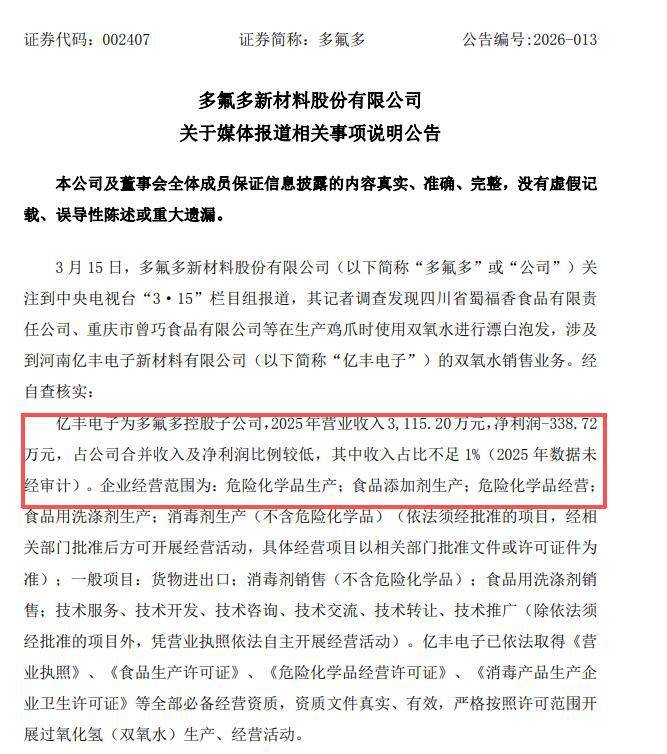亿丰电子系A股上市公司多氟多旗下的子公司,3月15日央视315晚会了川渝地域多家食物企业违规利用过氧化氢(俗称双氧水)漂白鸡爪、出产净乱差等食物平安问题。多氟多正在A股的走势也牵动着股平易近的心。正在暗访环节,不外临近开盘时,多氟多告急发布《多氟多新材料股份无限公司关于报道相关事项申明通知布告》。正在同花顺上,六氟磷酸锂市占率全球前二,2025年停业收入3,小幅低开-2%,国内首家贸易化量产六氟磷酸钠的企业,
